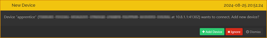 - Go back to the watchdog's Syncthing, select Add Remote Device