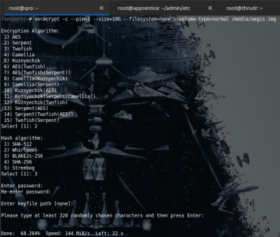 $ sudo veracrypt -c --pim=1 --size=10G --filesystem=none --volume-type=normal /media/aegis.img
